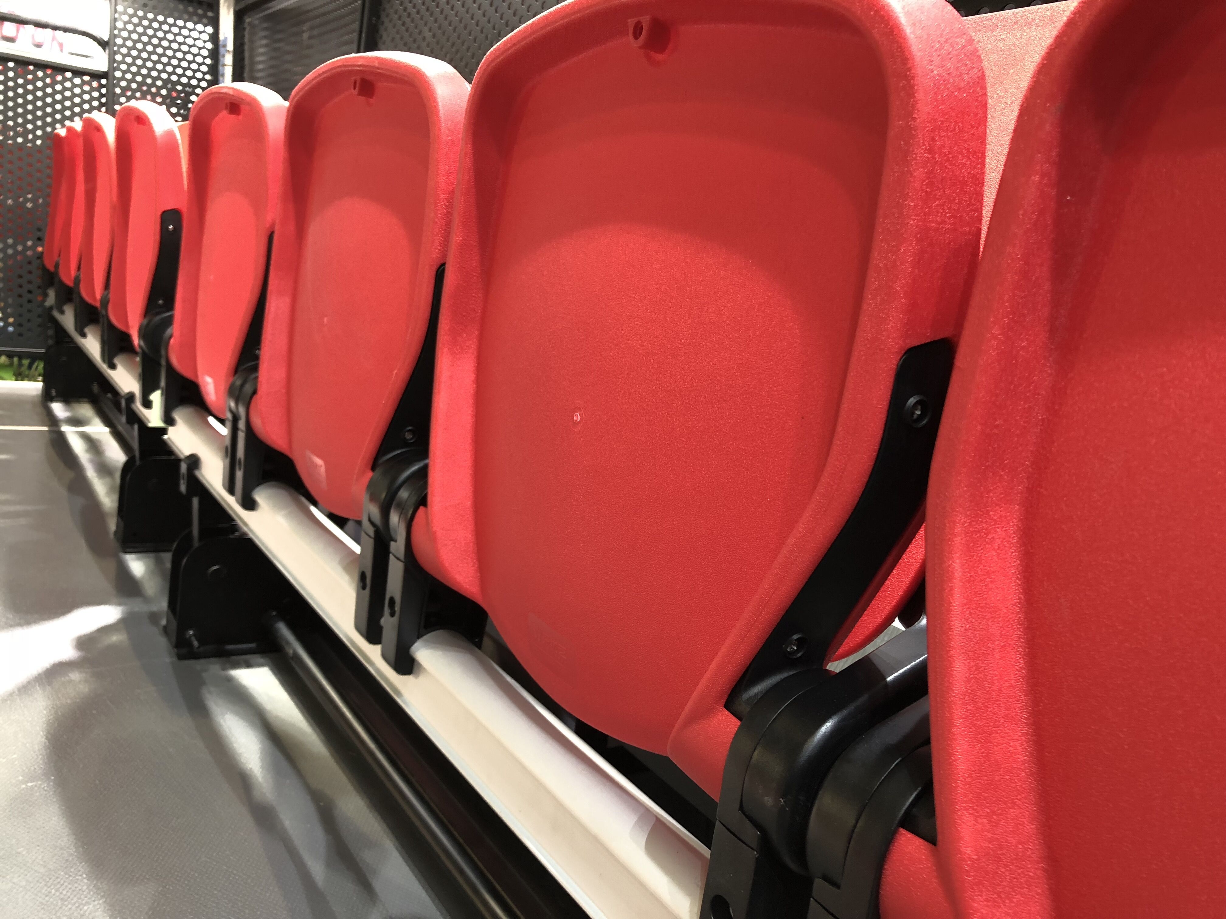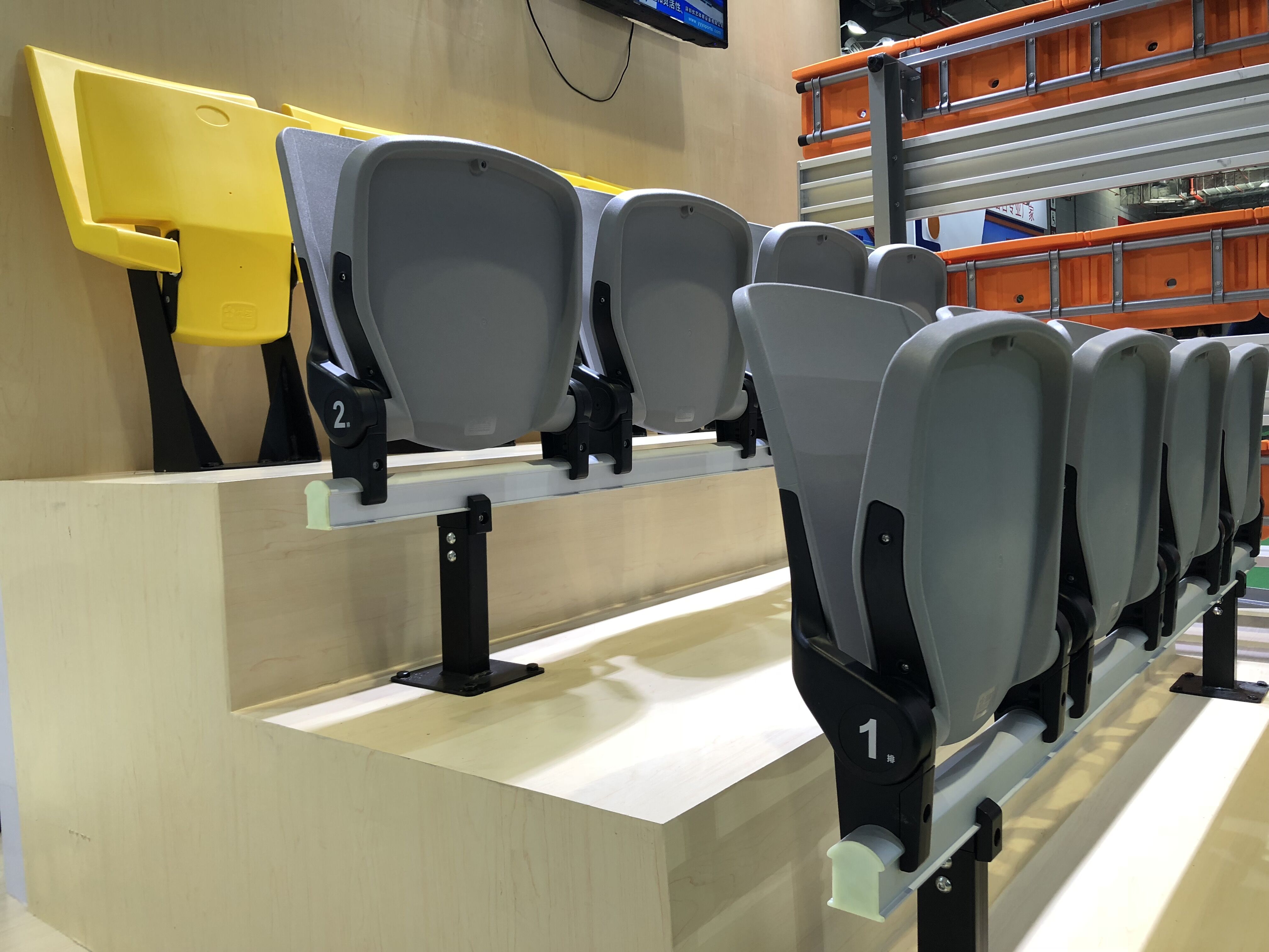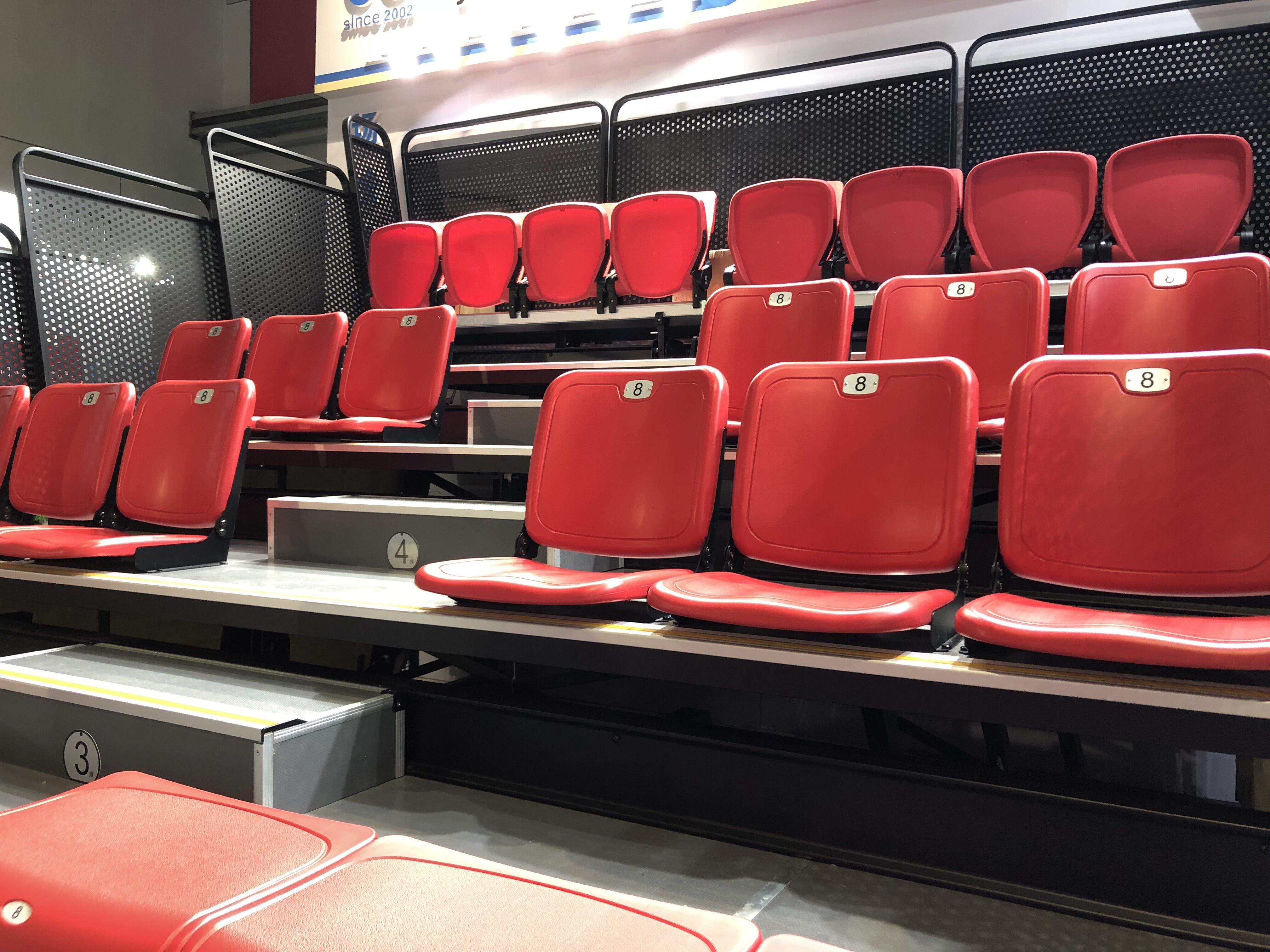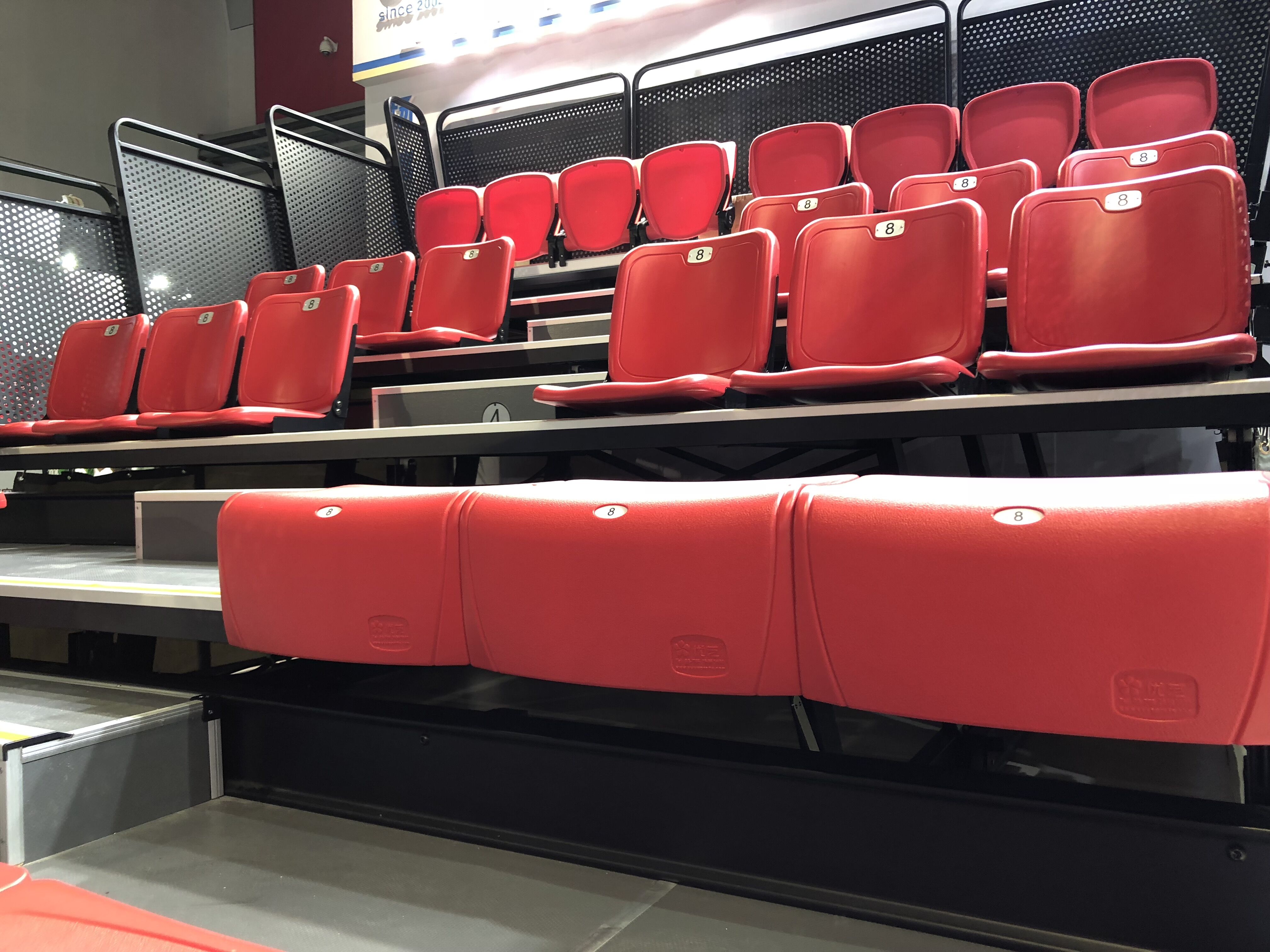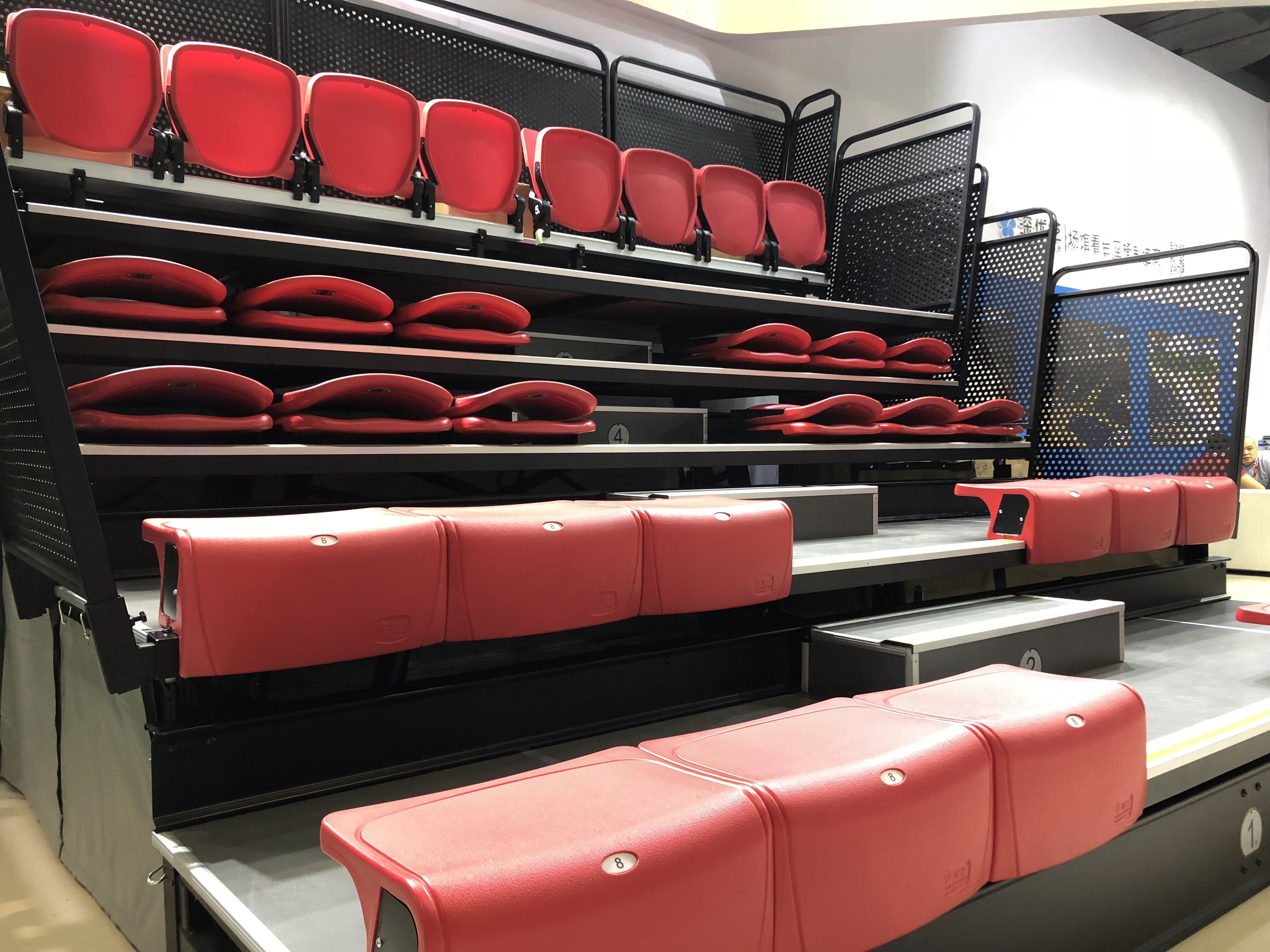二:移動鋁合金看臺。特點:使用方便,便于存儲,解決場館運用中臨時增加座位的困難。